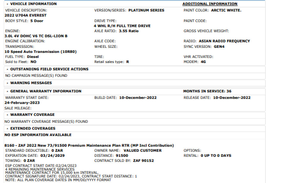 R899 899 R19 397 pmiStandard factory specifications - ABS, Auto Windscreen Wipers, Air bags 6, Auto lights, Day lights, Auto lock, ISO fix, Brake hazard lights, Power steering, Steering adjustment, Cruise control, Seats 7, Spare wheel FULLSIZE, Keyless entry, Air conditioner, Climate control, Electric windows, Radio, Leather, Remote side mirrors, Park distance - rear, Alloy wheels, Fuel DIESEL, Engine LONGITUDINAL V 6, Engine size 2993cc, CO2 224g/Km, Power 184kW@3250, Torque 600Nm@2500, DOHC, 4 VALVES PER CYLINDER, Gears 10, Drive ALL, Top speed 180Km/h, Boot capacity 0 litres, Average fuel consumption 8.5l/100km, Service interval 15000km