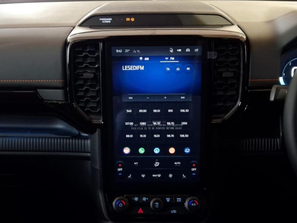 R1 049 890 R22 630 pmi3.0 Diesel V6, 184KW & 600NM, Matrix LED Lighting, Automatic headlamp Levelling, Stop / Start System, Heated Front Seats, E-Shifter, 360 Degree Camera, Adaptive Cruise Control, BLIS with Rear Cross traffic alert, Drive Modes – Normal - Eco - Tow/Haul – Slippery - Mud & Rut Sand, Zone Lighting, TPMS, 400W Inverter, LED Fog Lamps, Side Steps, sports hoop, Roof Rails, Leather Seats, B&O Sound System, 8 Speakers, Wireless Charger, Voice Control, 12” Touch Screen, SYNC4 High, Integrated Box step, 17” Alloy Wheels, All Terrain Tyres, Adjustable Sports Bar, Off-Road Suspension, Large Wheel Arch Flares, Side Steps, Windscreen washer level Warning Lamp, Accessory Switches, Increased Ride Height, Additional Drive mode – Rock Crawl