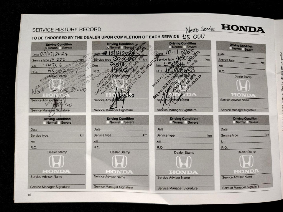 R279 950 R6 034 pmiStandard factory specifications - ABS, Electronic brakeforce distribution, Air bags 6, Day lights, Auto lock, ISO fix, Brake hazard lights, Power steering, Steering adjustment, Seats 7, Spare wheel FULLSIZE, Keyless entry, Air conditioner, Climate control, Electric windows, Radio, Remote side mirrors, Park distance - rear, Alloy wheels, Fuel UNLEADED, Engine TRANSVERSE INLINE 4, Engine size 1498cc, CO2 163g/Km, Power 89kW@6600, Torque 145Nm@4300, DOHC, 4 VALVES PER CYLINDER, I-VTEC, Gears 6, Drive FRONT, Boot capacity 244 litres, Average fuel consumption 6.8l/100km, Service interval 15000km