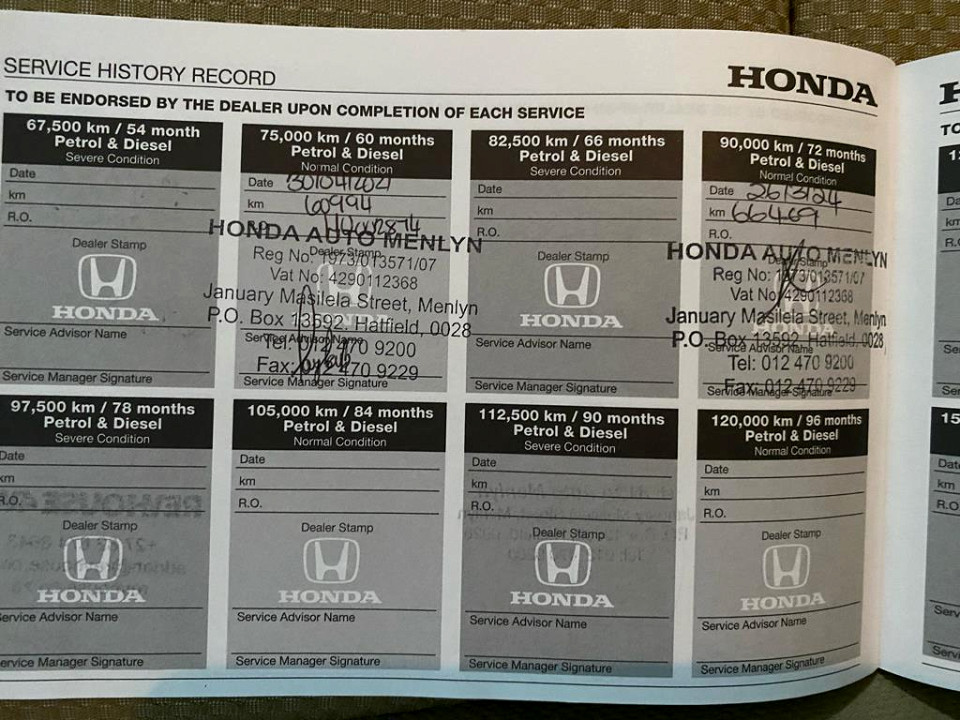 R100 000 R2 155 pmiStandard factory specifications - ABS, Electronic brakeforce distribution, Air bags 2, Power steering, Seats 5, Spare wheel FULLSIZE, Keyless entry, Air conditioner, Electric windows, Radio, Remote side mirrors, Fuel UNLEADED, Engine TRANSVERSE INLINE 4, Engine size 1198cc, CO2 133g/Km, Power 65kW@6000, Torque 109Nm@4500, SOHC i-VTEC, 4 VALVES PER CYLINDER, Gears 5, Drive FRONT, Top speed 145Km/h, Boot capacity 161 litres, Average fuel consumption 5.6l/100km, Service interval 15000km