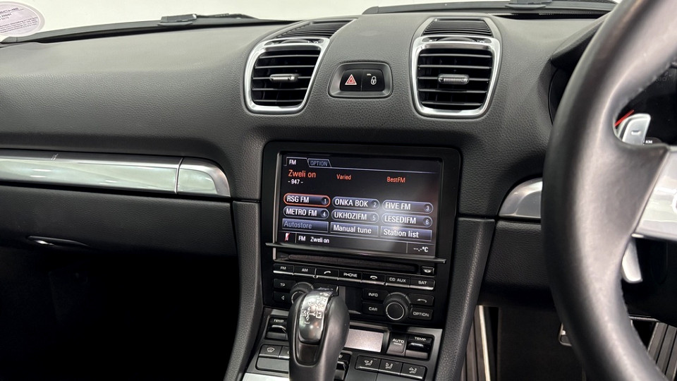 R699 900 R15 086 pmiStandard factory specifications - ABS, Electronic brakeforce distribution, Air bags 6, Auto lights, Day lights, Power steering, Seats 2, Spare wheel NA, Keyless entry, Air conditioner, Electric windows, Radio, Remote side mirrors, Satelite navigation, Alloy wheels, Fuel UNLEADED, Engine LONGITUDINAL FLAT 6, Engine size 2706cc, CO2 180g/Km, Power 202kW@7400, Torque 290Nm@4500, DOHC 4 VALVES PER CYLINDER, VARIO CAM PLUS, Gears 7, Drive REAR, Top speed 264Km/h, Boot capacity 150 litres, Average fuel consumption 7.7l/100km, Service interval 30000km
