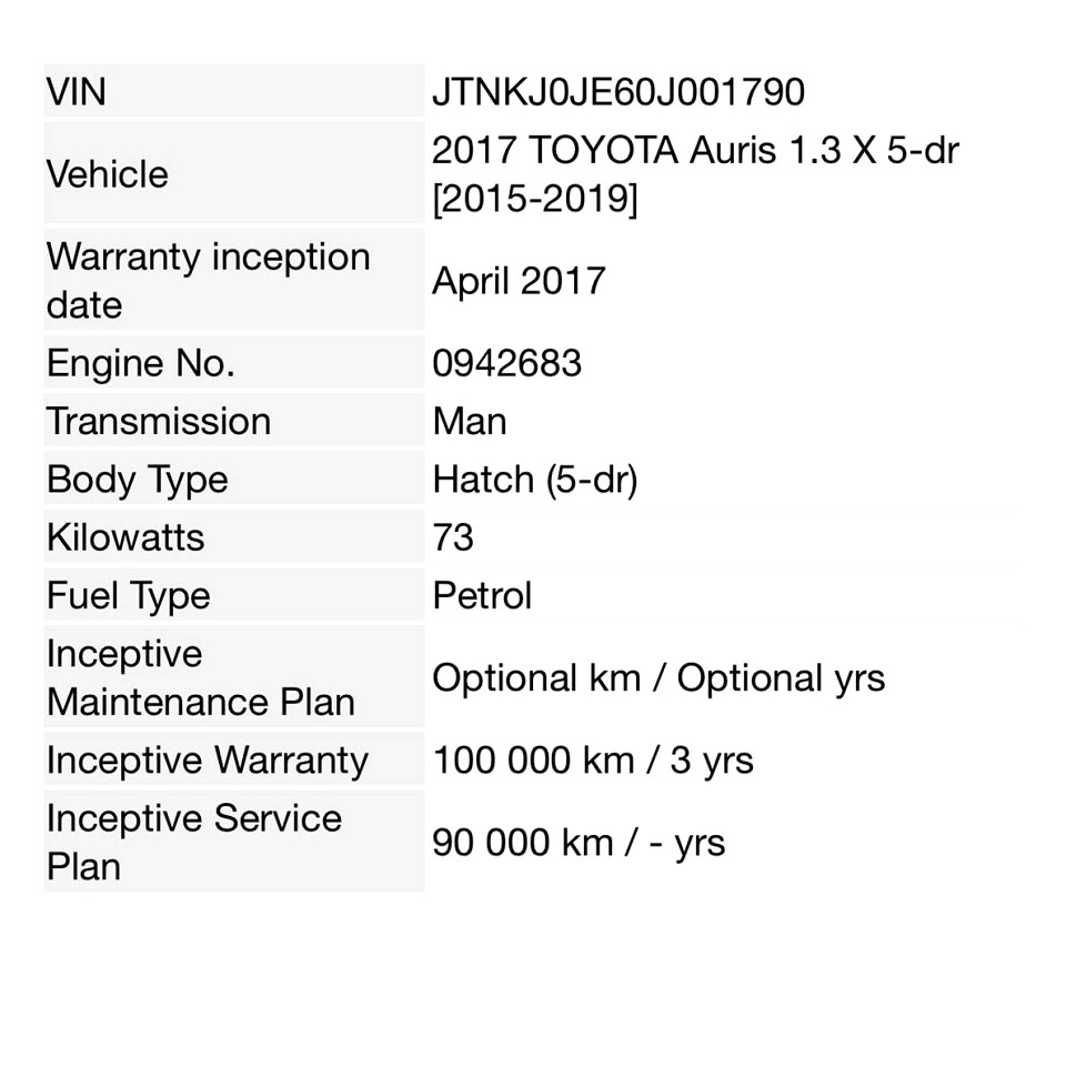 R139 900 R3 015 pmiStandard factory specifications - ABS, Electronic brakeforce distribution, Auto Windscreen Wipers, Air bags 4, Auto lights, ISO fix, Power steering, Steering adjustment, Seats 5, Spare wheel FULLSIZE, Keyless entry, Air conditioner, Electric windows, Radio, Remote side mirrors, Metallic, Fuel UNLEADED, Engine TRANSVERSE INLINE 4, Engine size 1329cc, CO2 134g/Km, Power 73kW@6000, Torque 128Nm@3800, DOHC 4 VALVES PER CYLINDER, DUAL VVT-i, Gears 6, Drive FRONT, Top speed 175Km/h, Boot capacity 360 litres, Average fuel consumption 5.8l/100km, Service interval 15000km