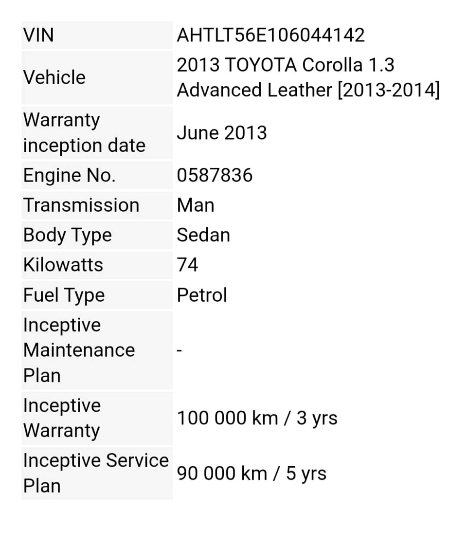 R139 900 R3 015 pmiStandard factory specifications - ABS, Electronic brakeforce distribution, Air bags 7, Power steering, Steering adjustment, Multi function steering wheel, Seats 5, Spare wheel FULLSIZE, Keyless entry, Air conditioner, Electric windows, Radio, Remote side mirrors, Metallic, Alloy wheels, Fuel UNLEADED, Engine TRANSVERSE INLINE 4, Engine size 1329cc, CO2 158g/Km, Power 74kW@6000, Torque 132Nm@3800, DOHC 4 VALVES PER CYLINDER, VARIABLE VALVE TIMING, Gears 6, Drive FRONT, Top speed 180Km/h, Boot capacity 450 litres, Average fuel consumption 5.9l/100km, Service interval 15000km